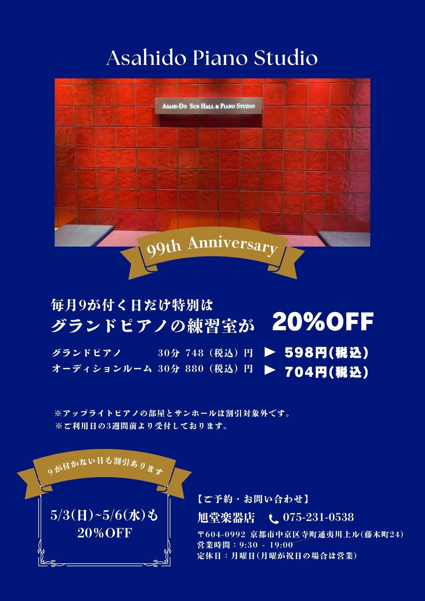 2026年、旭堂楽器店が創業99周年を迎えました。日頃の感謝を込めて、4月からは、毎月9が付く日はグランドピアノの練習室を20%割引させていただきます!