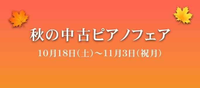 秋が近づくこの季節に、お得な中古ピアノは、いかがですか?お手頃価格でご提供sするピアノセール。「秋の中古ピアノフェア」は10月18日(土)~11月3日(祝月)まで開催。ピアノをお探しならこの機会にぜひどうぞ。