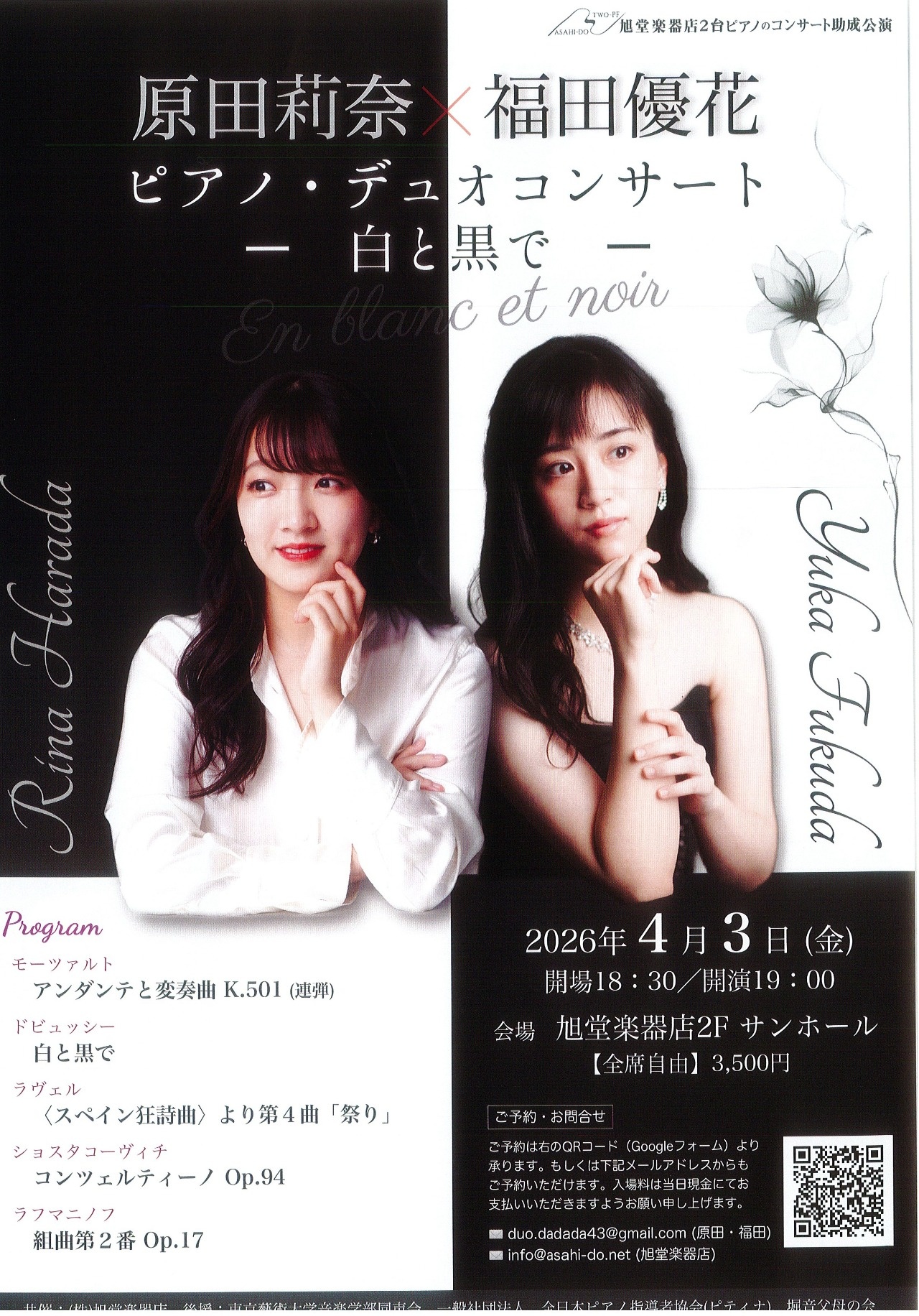 | 4月3日(金) | 2台ピアノのコンサート助成公演 原田莉奈×福田優花 ピアノデュオコンサート -白と黒で- | |